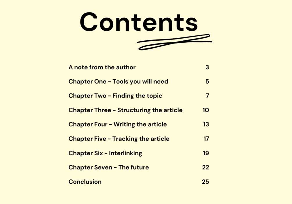 27 pages of SEO writing advice, split into 7 chapters. Plus 77 example articles.